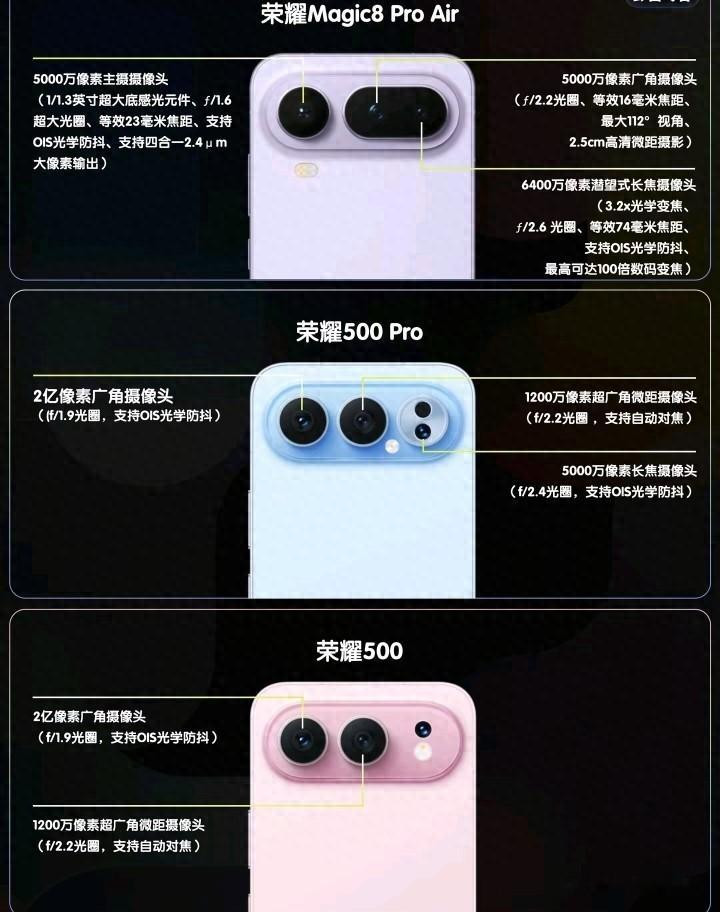 2026年,荣耀厚爱向市集展示了其在该年度重心布局的三款全新智妙手机,分别是定位顶级影像旗舰的荣耀Magic8 Pro Air,以及主打高性能与万能体验的荣耀500 Pro和荣耀500。这三款新机在录像头模构成立上展现了判然不同的盘算念念路与时代侧重,明晰地勾画出荣耀在2026年针对不同用户群体的居品政策。本次发布不仅明确了各机型的具体硬件参数,更通过相反化的镜头组合闲隙了从专科影相爱重者到年青潮水用户的各样化需求。