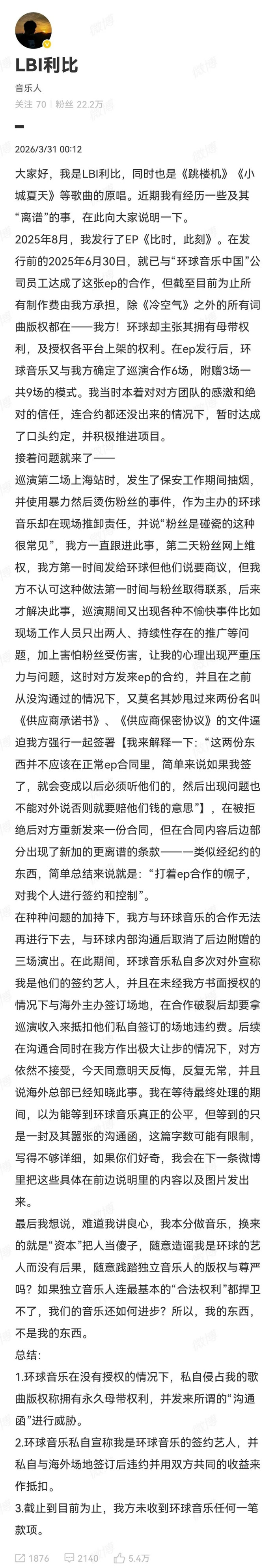 3月31日凌晨,音乐东说念主利比发布长文,共享近期与“公共音乐中国”的纠纷。他自行归来了三点实践,具体如下: