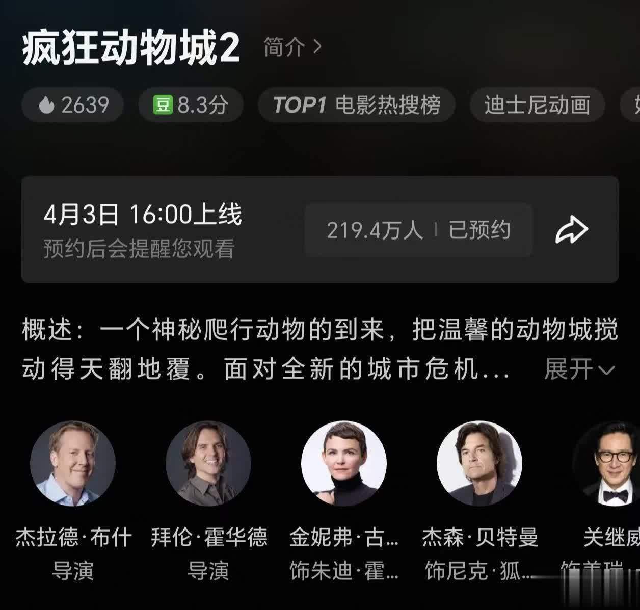 几个小时前,《放纵动物城2》官宣将于本年4月3日下昼四点开动在线上视频平台播出。