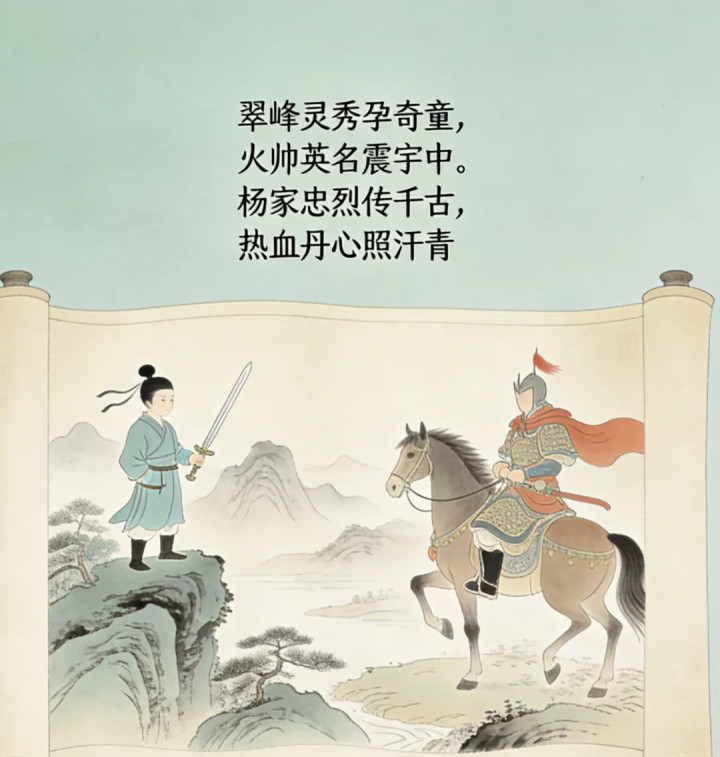 “翠峰灵童起,杨家忠魂续。北疆安社稷,青史留英名。”