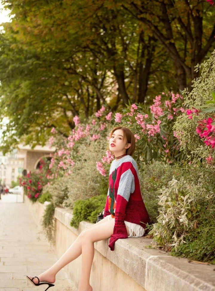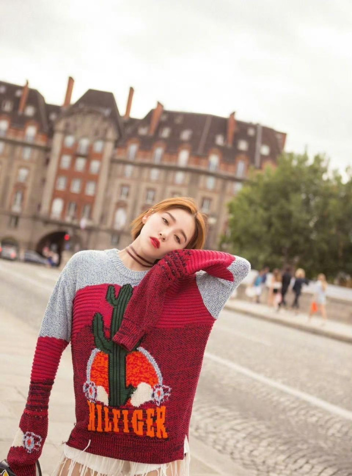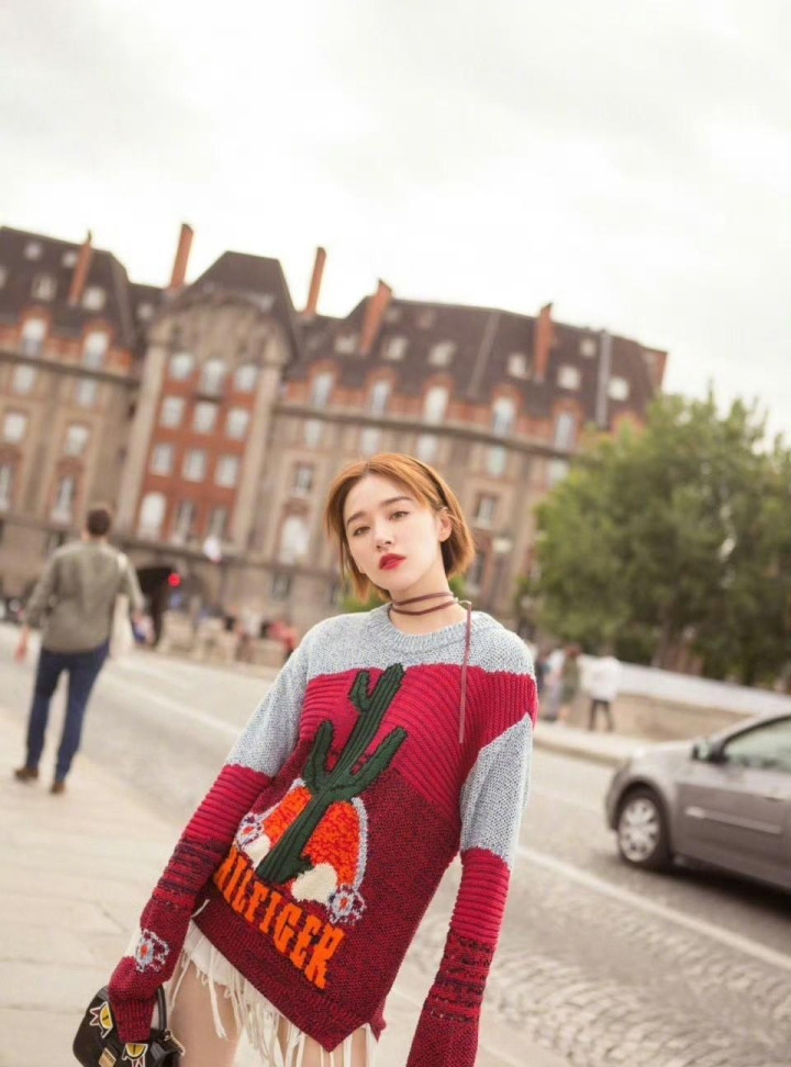 最抓眼的是那件红灰撞色毛衣。 仙东说念主掌图案本人就挺跳,放在欧式街头里,不会闷,反而有种轻率感。