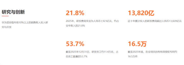 华为研发插足再创历史新高,2025年研发插足达1923亿元,约占全年收入的21.8%,近十年累计插足的研发用度超越1.38万亿元。
