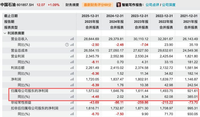 中石油 2025 年归母净利润同比 - 4.5%(近五年头次负增长),中枢是油价大跌 + 卑劣需求走弱 + 库存减值三重压力重叠,全产业链同步承压。