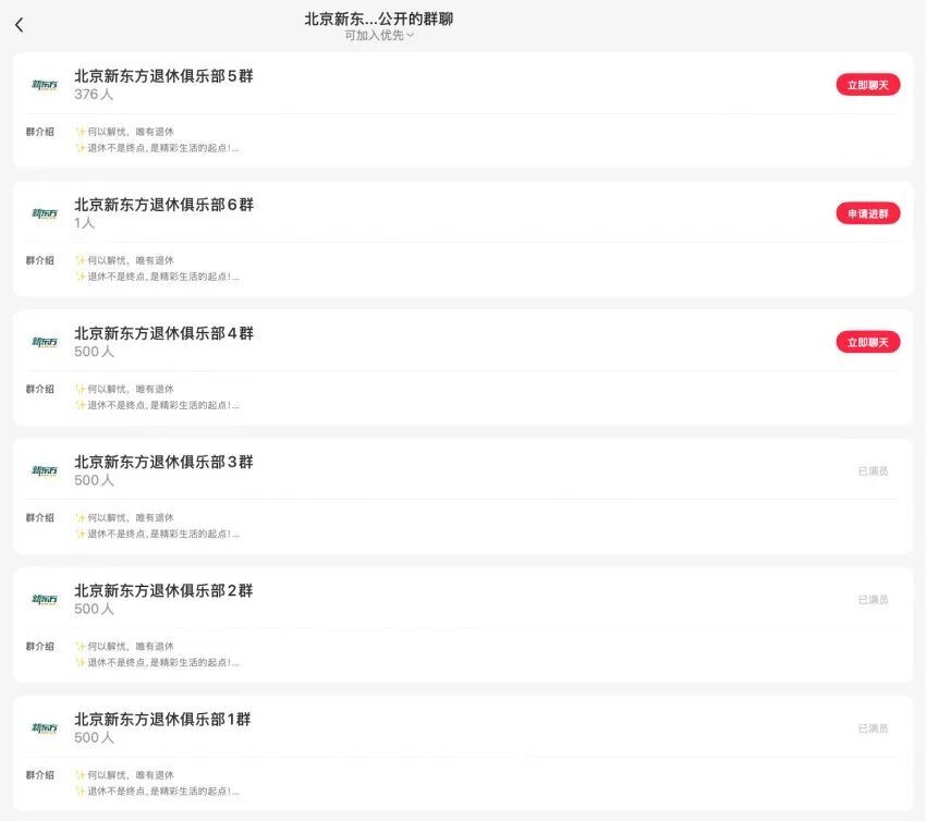 初步来看,用户对退休俱乐部的参与积极性飞扬。据盐财经不雅察,其官方粉丝群增长势头迅猛,现在已在小红书创建了6个粉丝群,其中3个群在短短一段时辰内便飞快满员(每个群500东谈主),群内既有北京腹地的老年东谈主主动守护课程报名事宜、期待尽快开课,也有不少年青东谈主主动参议辩论情况,策划为父母报名。