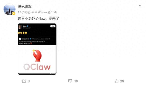 腾讯公关总监张军也同步发文说明:“这只小龙虾Qclaw,要来了。”