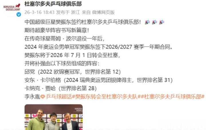 在3月16日,德甲权门杜塞尔多夫俱乐部官方晓谕,樊振东已与球队签下一份为期一年的条约,将于2026年7月1日精采从萨尔布吕肯转会而来。